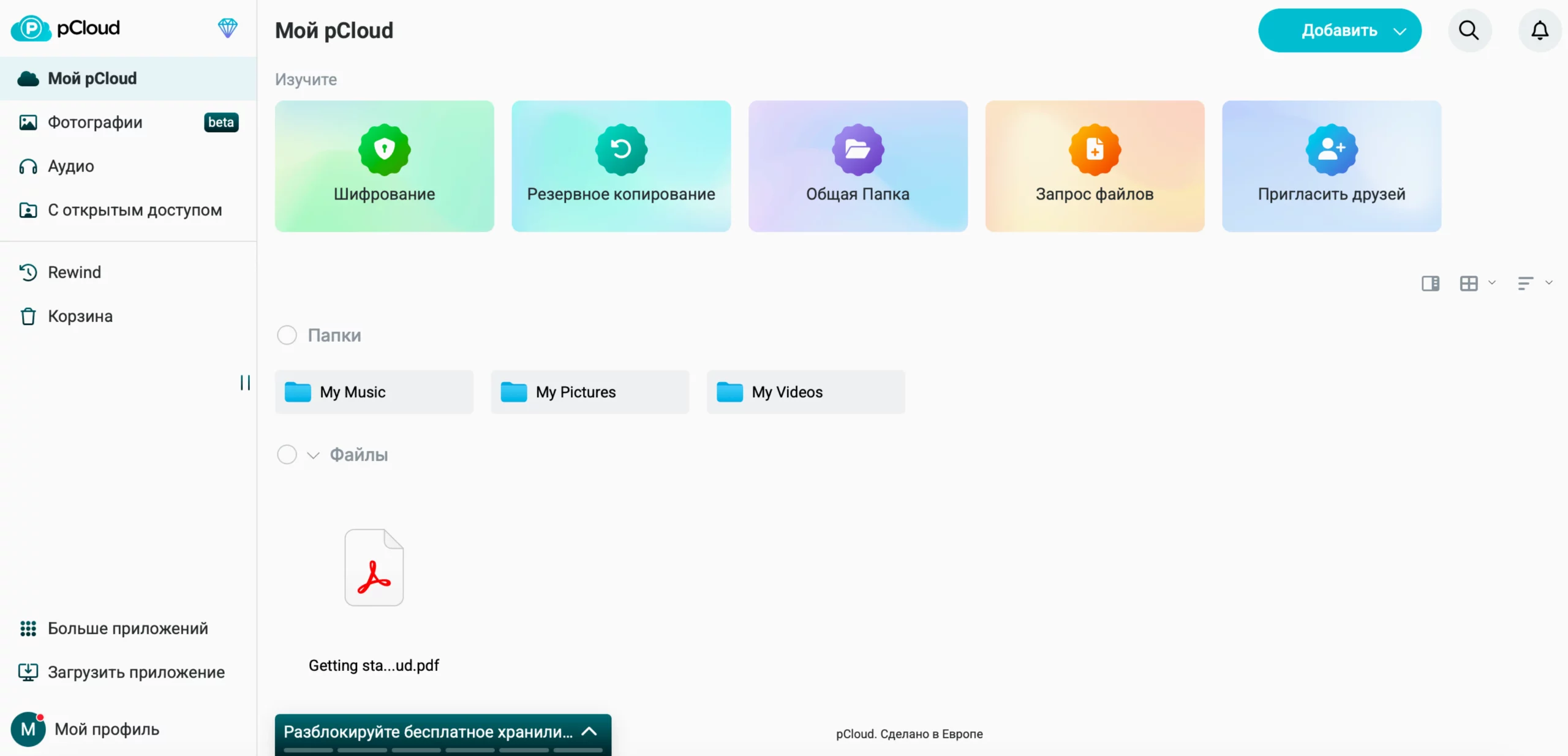 Сервис pCloud — возможно, не самое лучшее облако для хранения файлов большого объема, но пригодится тем, кто часто ездит за границу, потому что это европейский продукт. Он предлагает лишь 3 ГБ бесплатного места в хранилище, но, если приглашать друзей, объем увеличится до 10 ГБ. За большее придется платить. Примерно 400 руб./мес. будут стоить 500 ГБ. Максимальный доступный объем — 10 ТБ. Тариф не оплатить российской картой.