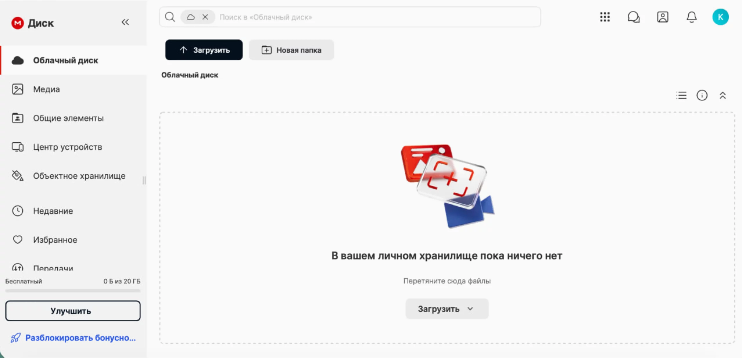 Интерфейс сервиса максимально аскетичный: несколько функций и большая кнопка «Загрузить» для файлов. Функциональность ограничена — пользователь может лишь загружать и скачивать файлы. Нет ни возможности совместной работы, ни редактора фото и видео, ни поиска материалов.