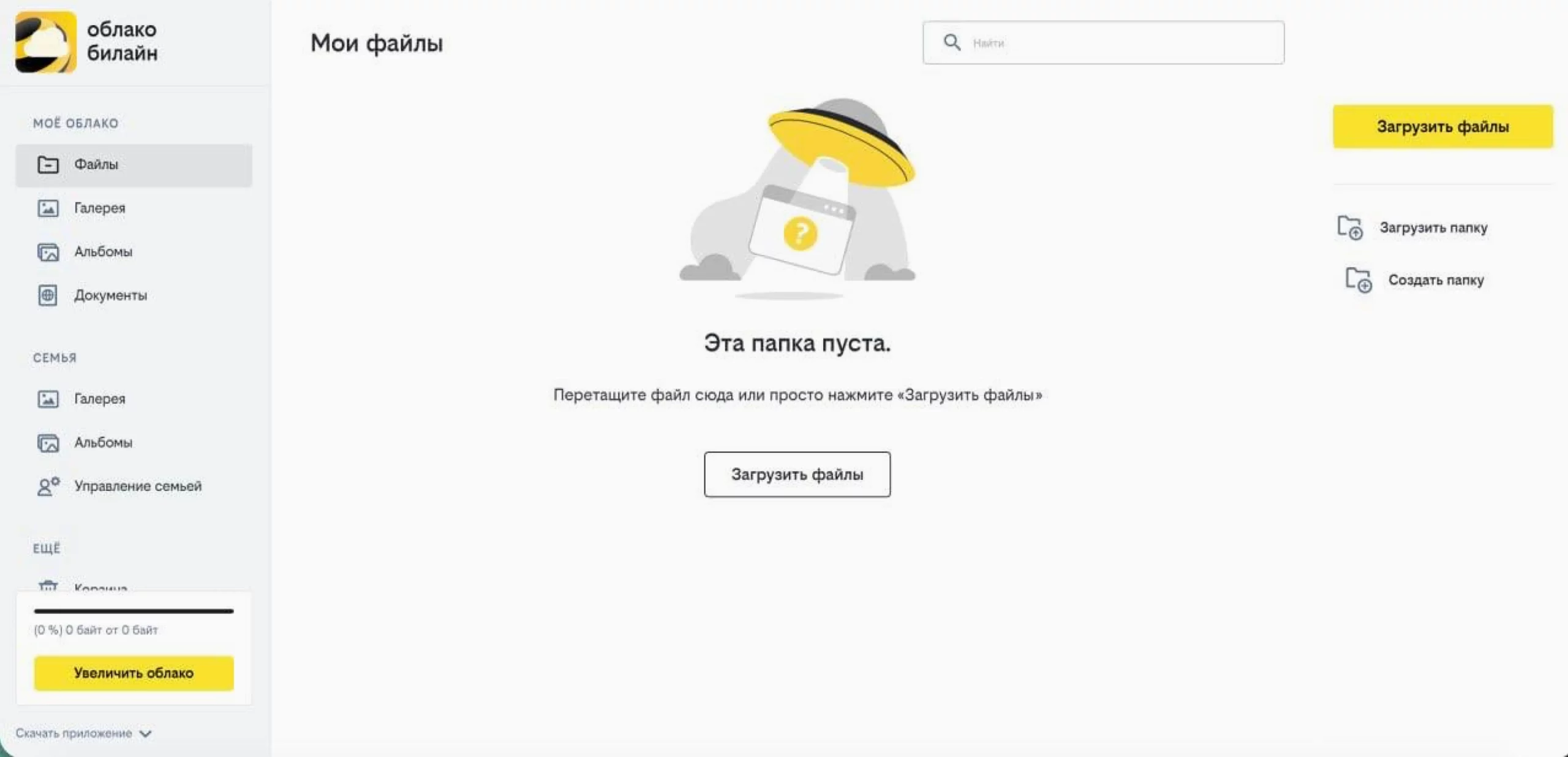 Среди лучших бесплатных облачных хранилищ с большим объемом от российских разработчиков отметим «Облако Билайн». Оно доступно для всех, но у клиентов сотового оператора есть несколько привилегий — экономия трафика, скидки на тарифы и отсутствие рекламы. После регистрации вы получаете 10 ГБ бесплатного места. Если хотите увеличить объем, доступно три тарифных плана — 250 ГБ, 500 ГБ и 1 ТБ. Цены стартуют с отметки 75 руб./мес.